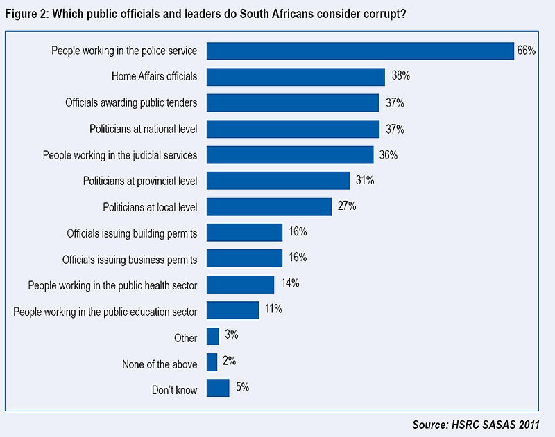 Two-thirds of South Africans believe the most corrupt government officials are in the national police service, followed by those in the Department of Home Affairs – these are among the findings recently released as part of a Human Sciences Research Council (HSRC) survey.